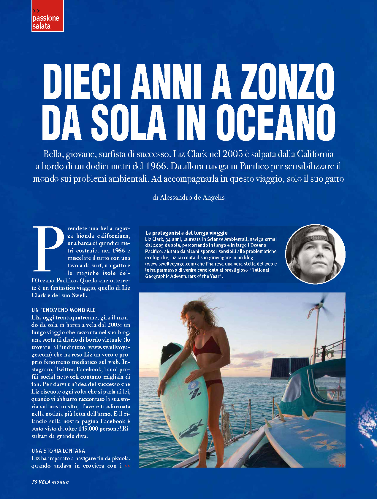 Bella, giovane, surfista di successo, Liz Clark nel 2005 è salpata dalla California a bordo di un dodici metri del 1966. Da allora naviga in Pacifico per sensibilizzare il mondo sui problemi ambientali. Ad accompagnarla in questo viaggio, solo il suo gatto. Quando vi abbiamo raccontato in breve la sua storia sul nosto sito, l’avete letta in 145mila!