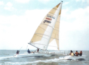 Da là, il timoniere timonava mentre l’equipaggio manovrava le vele e lo stabilizzatore, che poteva essere spostato da un lato all’altro per fare leva, formando un trimarano. La teoria dietro all’armo voleva che funzionasse come nei windsurf, dove l’albero si inclinava fino a 30 gradi e fornendo una spinta verso l’alto alla barca. La sfida, tuttavia, era evitare che l’albero cadesse: quando lo stabilizzatore era completamente esteso, non c’era nessuna sartia di sottovento a sostenerlo. Toccava alla pressione del vento tenerlo su e lo stabilizzatore doveva essere ricalibrato sempre prima di rallentare per fermare la barca…”