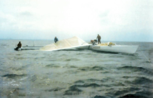 Ma proprio quando c’è da battere il record, il disastro: “Eravamo con 18 nodi d’aria circa, e andavamo a più di 27 nodi quando abbiamo sentito un suono smorzato dalla poppa. Poco dopo, abbiamo sentito Jan (Gougeon, ndr) gridare ‘Non governo!!!!!’. La barca si è staccata dall’acqua e ha accelerato a una velocità che probabilmente eguagliava quella del record del mondo, ma mentre volavamo in poppa, i nostri occhi erano incollati sull’albero, che stava cadendo. Peter, seduto nella parte anteriore della capsula, ha calcolato che stava arrivando su di lui e si è buttato fuori dalla barca a circa 30 nodi, saltando sull’acqua come una pietra piatta”.