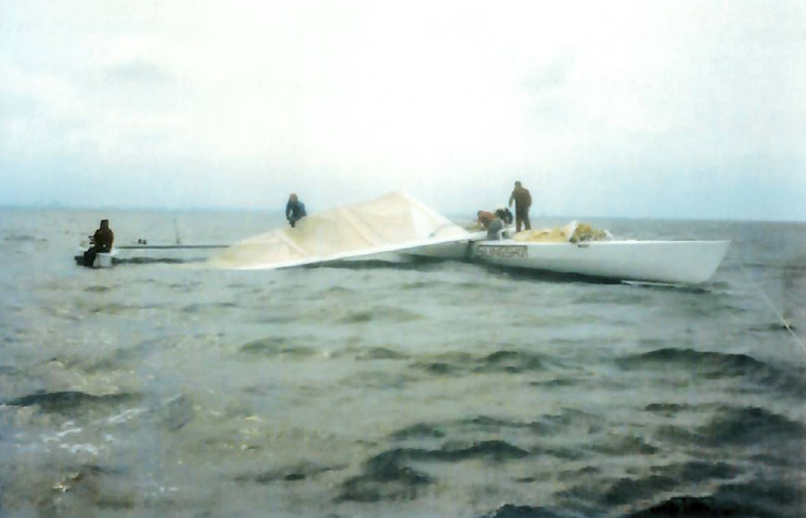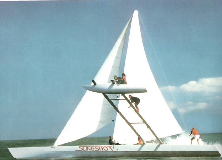 Da là, il timoniere timonava mentre l’equipaggio manovrava le vele e lo stabilizzatore, che poteva essere spostato da un lato all’altro per fare leva, formando un trimarano. La teoria dietro all’armo voleva che funzionasse come nei windsurf, dove l’albero si inclinava fino a 30 gradi e fornendo una spinta verso l’alto alla barca. La sfida, tuttavia, era evitare che l’albero cadesse: quando lo stabilizzatore era completamente esteso, non c’era nessuna sartia di sottovento a sostenerlo. Toccava alla pressione del vento tenerlo su e lo stabilizzatore doveva essere ricalibrato sempre prima di rallentare per fermare la barca…”