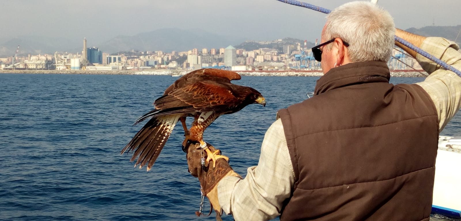 Along the docks of Genoa’s Old Port last Sunday there was an unusual gathering of people. Intrigued, we approached and saw that aboard three sailboats a falconry display was being prepared in the open sea. Just before they dropped their