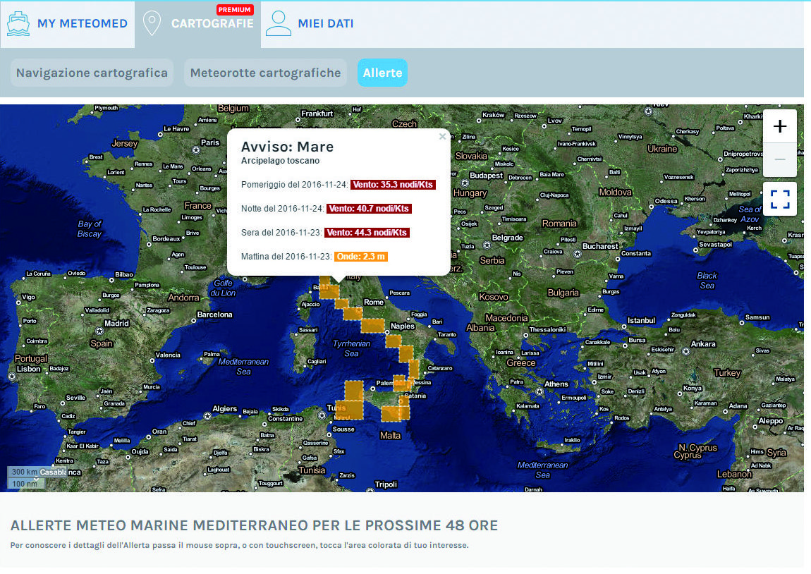 Service prices are proportional to its completeness and complexity. There are basically three packages offered by Meteomed: Basic, Premium (which incorporates mapping) and Top, which includes all of them plus telephone counseling. There is also an upgrade to the Top, the Race service, which is very specialized, aimed at racing and modulated to each individual event. www.meteomed.it