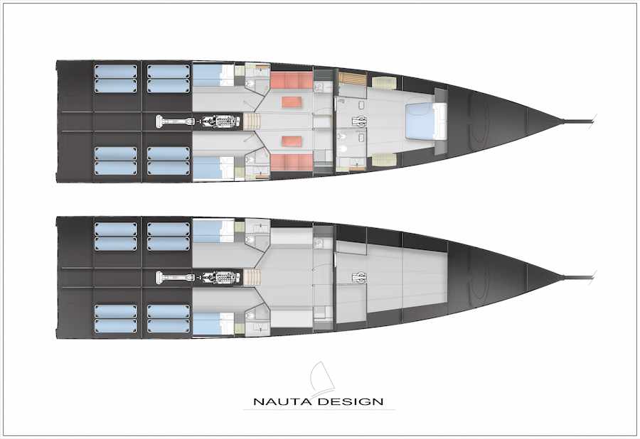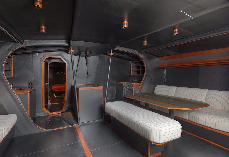 Ma questa volta My Song non è una barca con doppio uso, ma è come se fossero due barche in una: la prima per la regata, la seconda per la crociera. Così gli interni non sono solo realizzati con materiali leggerissimi e soluzioni come gli armadi che sono borse per lo stivaggio in tessuto. Sono in buona parte amovibili.