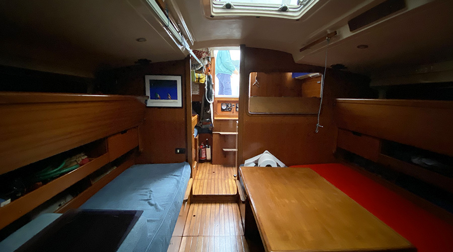 Per quanto riguarda gli interni, è necessario contestualizzare il periodo, la dimensione e la tipologia di utenza cui la barca apparteneva. Negli Anni Settanta le compartimentazioni interne erano innanzitutto mirate alla fruizione in navigazione, soprattutto sulle barche da crociera come questo 35’, barche pensate per poter affrontare viaggi impegnativi e conseguentemente attrezzate per poter gestire le possibili condizioni incontrate. In luce di questa sua destinazione d’uso, il Dufour 35 presenta infatti volumi particolarmente abbondanti per un 10 metri, volumi garantiti appunto dal baglio più che generoso, funzionale quindi non solo alla performance, ma anche all’abitabilità della barca stessa. Oltremodo spazioso per la sua classe, il Dufour 35 alloggia infatti fino a 8/9 persone, sebbene in spazi molto condensati, ma dalle altezze confortevoli, intorno al metro e novanta, numeri tutt’oggi rari per la stazza.