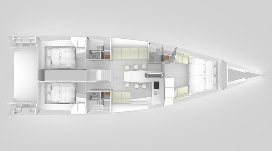 Available in as many as 4 variants (2×2; 3×3; 3×3 V2 and 2×2 Race), the configuration is mainly based on a standard, twin doubles in the stern, twin services on the broadside, large central open space salon and forward triangle. Here, in the last one, we have the difference between the three versions: the 2×2 (featured in the video) here houses a convivial corner with table and sofas; the 3×3 there houses a third cabin with a full-beam double; and the 3×3 v2 features a reduced third cabin with a smaller double, but private toilet. The 2×2 Race variant, on the other hand, retains the structure of the 2×2, stripping it of the superfluous and optimizing space for performance.