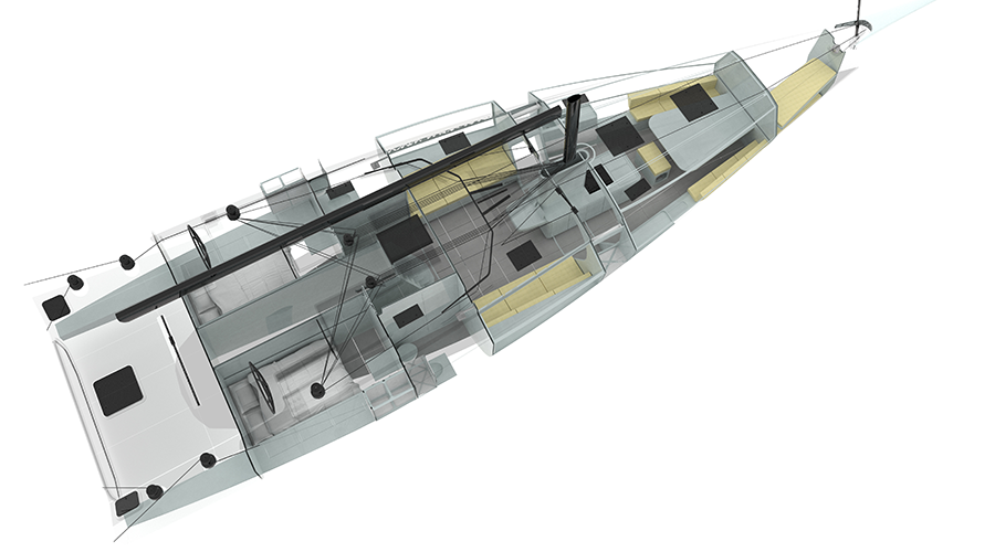 The yard’s work, however, does not stop at lines and volumes, but also plays out at the ‘weight’ juncture, where the Neo 570c ranks as a ‘featherweight’ thanks to a net of 11.5 tons, almost half of which, 5.3 tons, is ballast alone. Not insignificant numbers that can be translated into a boat with an overtly competitive spirit, but one that also indulges in cruising, which is nevertheless a central component of the project. And it is not only a cruiser in words, but also in deeds, so much so that it has innovative solutions even below deck and, to make the owner’s life easier, also reduced ‘footprint’, thanks to a