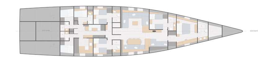 L’ampia cabina armatoriale di prua prevede diversi allestimenti, tra cui quella con una cabina armadio, quella con bagni separati per lui e per lei, o quella con sedute relax. A bordo sono previste altre tre suite per gli ospiti, più due cabine per l’equipaggio e una riservata al capitano.