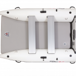The transom is made of rigid plastic, equipped with a drain plug. On the deck we find in addition to the screw-down rowlocks with rotary joint, four inner handles at the top, and four outer handles, and four steel rings for rigging the tender on deck. On the sides of the tubulars are black protective fender bands.