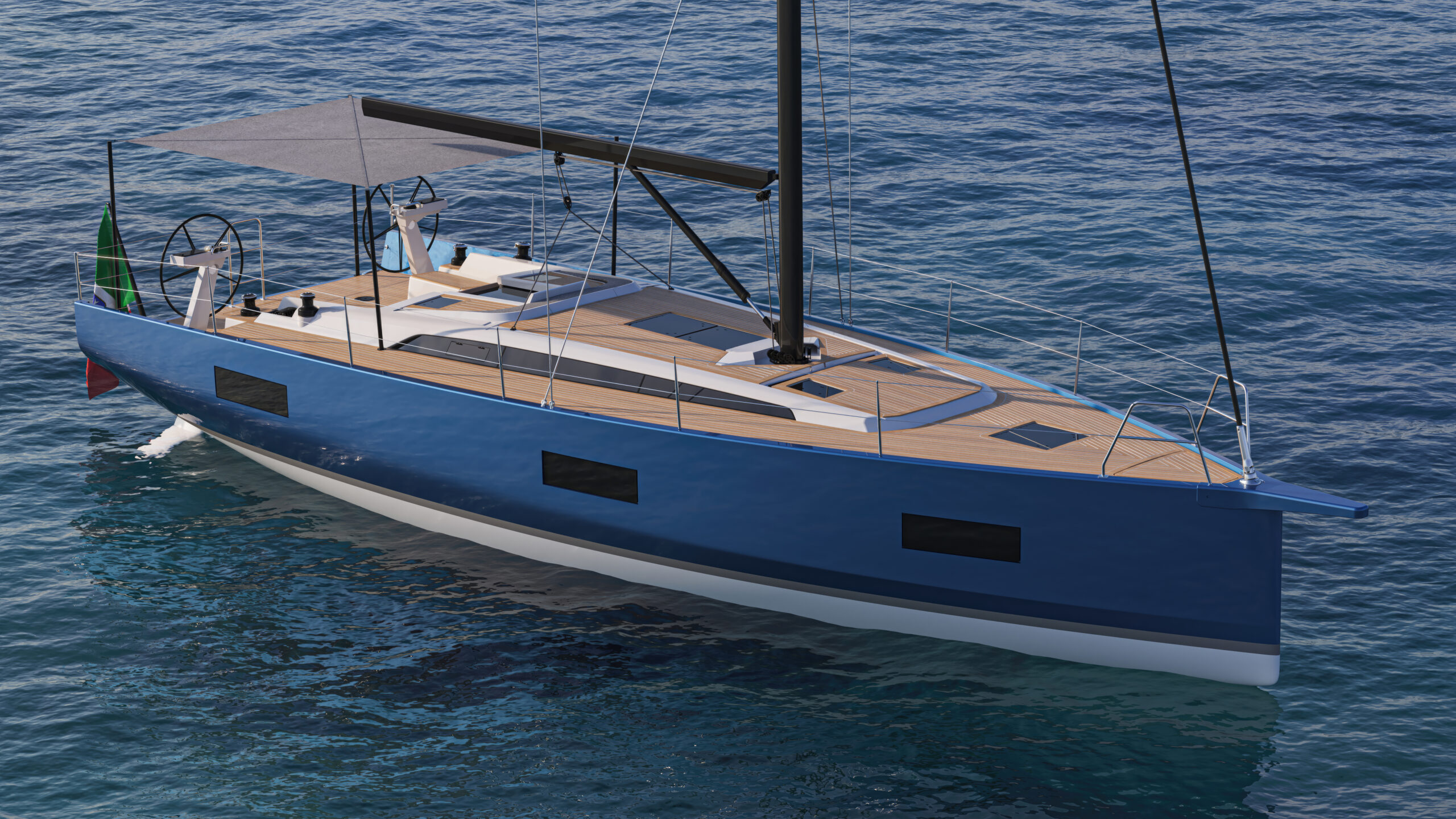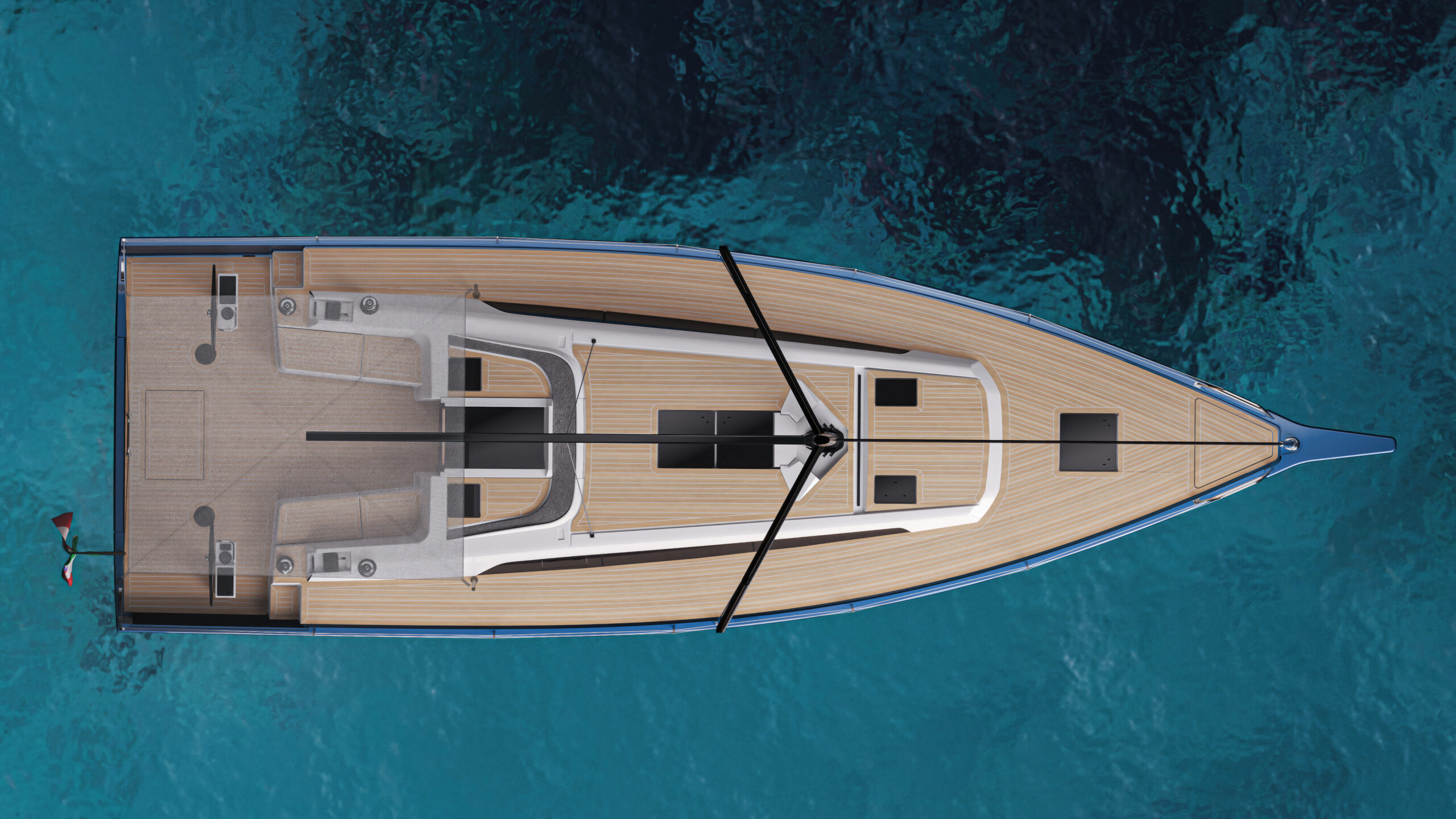 The need from which this operation starts lies in the desire to offer the market A cockpit that is 100% free of any clutter. No mainsail fixed point, no undercarriage, and no backstay, so that the outdoor living area becomes 100 percent usable in every inch of it. To pursue this choice, Solaris studied solutions that would still enhance the sailing qualities of the boat without penalizing the pleasure of sailing.