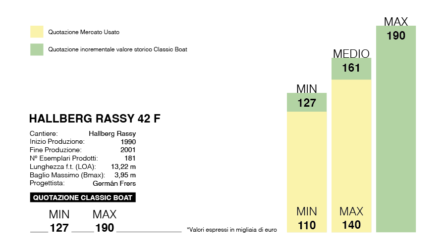 Classic Boat historical value significantly increases the price of the 42 F. A model in perfect condition and preservation can be worth up to 190,000 euros today. One in fair/good condition gains 21,000 over the pre-historical value listing, 140 vs. 161,000.