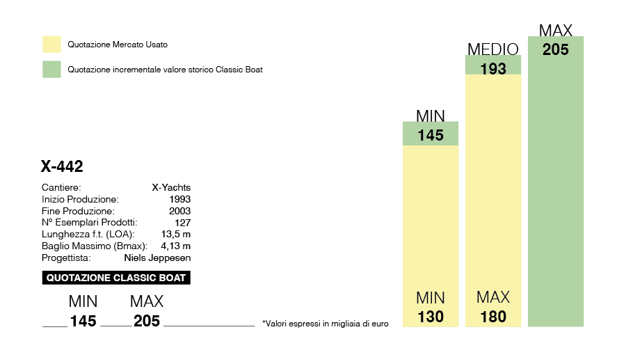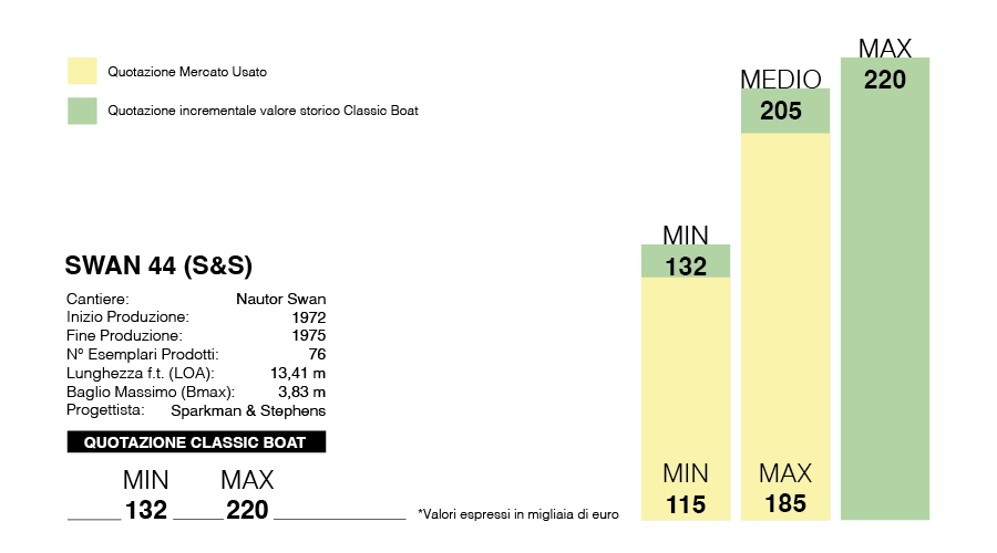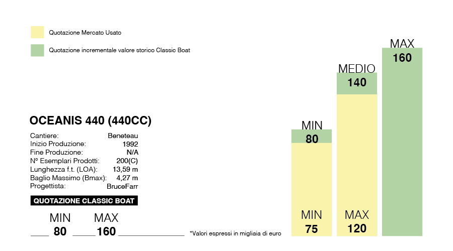 Classic Boat historical value significantly increases the quotation of 440. A model in perfect condition and preservation can be worth up to 160,000 euros today. One in fair/good condition gains 20,000 over the pre-historical value listing, 140 vs. 120,000.