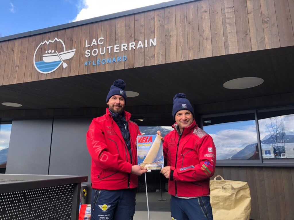 Manuel Vlacich e Franco Deganutti con la copia di marzo del Giornale della Vela pronti alla navigazione sul lago sotterraneo in Svizzera