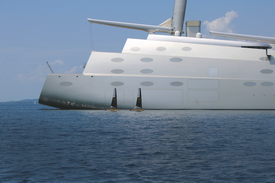Sopra, Franco Deganutti e Manuel Vlacich circumnavigano il superyacht “A” a Trieste
