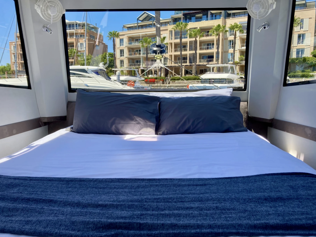 Il baglio massimo è di 3,5 metri e non manca la classica rete prodiera, la caratteristica area prendisole sospesa sull’acqua tipica dei catamarani. Il cantiere HopYacht ha voluto creare una barca non troppo grossa, ma con ogni tipo di comfort a bordo, incluso un impianto di aria condizionata a basso impatto energetico per raffrescare l’ambiente nelle calde giornate estive.