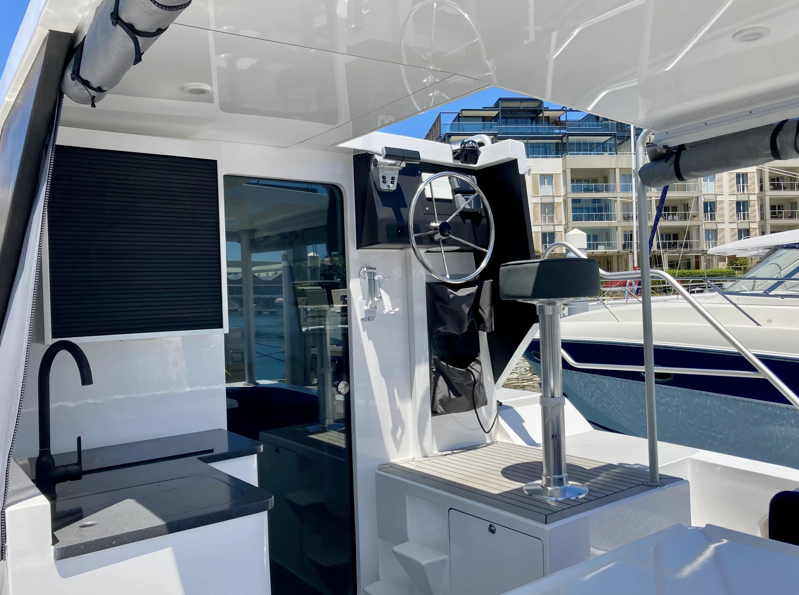 Il layout del 30 piedi americano, infatti, è molto lineare e prevede un unico ponte che include uno spazio a poppa molto ben studiato, con divano a C abbattibile, mobile cucina e postazione di comando a dritta, una dinette con divanetto e bagno e, a prua, una stanza con letto matrimoniale queen size.