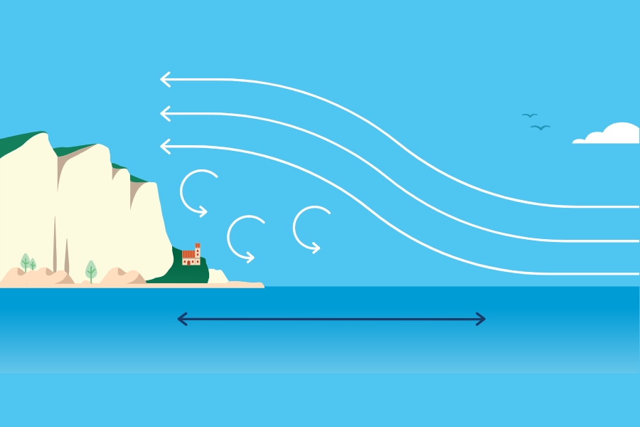 The wind undergoes consistent changes near the coast when the coast is high, even if it consists of reliefs of varying size, not only if it is a classic sheer cliff.
