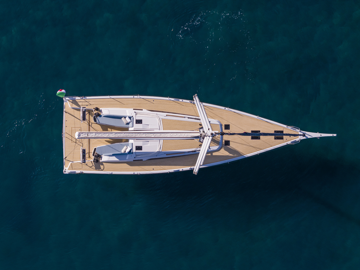 As can be imagined, the two versions differ in deck configuration and sail plan structure. The “Performance” version features a less pulled deck plan, with 4 aft winches, fixed point mainsail sheet, self tacking jib and carbon bowsprit; the cockpit is free from rigging to be safely usable by guests while cruising.