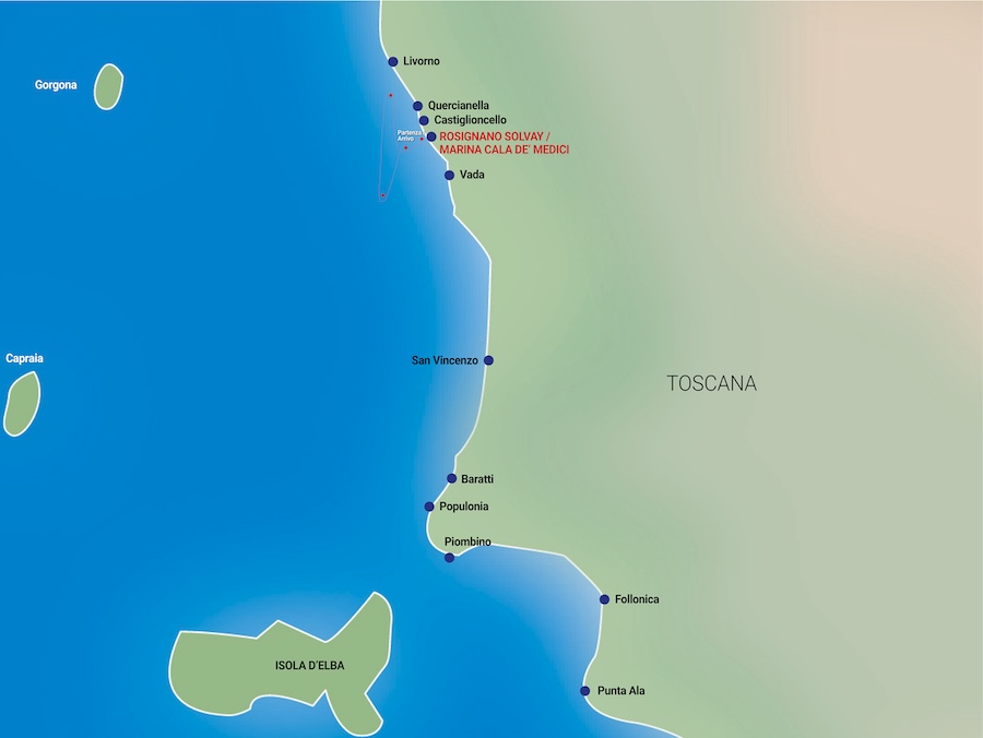 The nerve center of the very rich VELA Cup Toscana weekend is the Marina Cala de’ Medici between Rosignano Solvay Castiglioncello (in red in the map above), which is located in the center of Tuscany, on a picturesque stretch of coastline in the heart of the Etruscan Coast. From here it is very convenient to take a cruise to the most beautiful islands in the area, such as Gorgona, Capraia, or Elba, since they are all less than 50 nautical miles away.