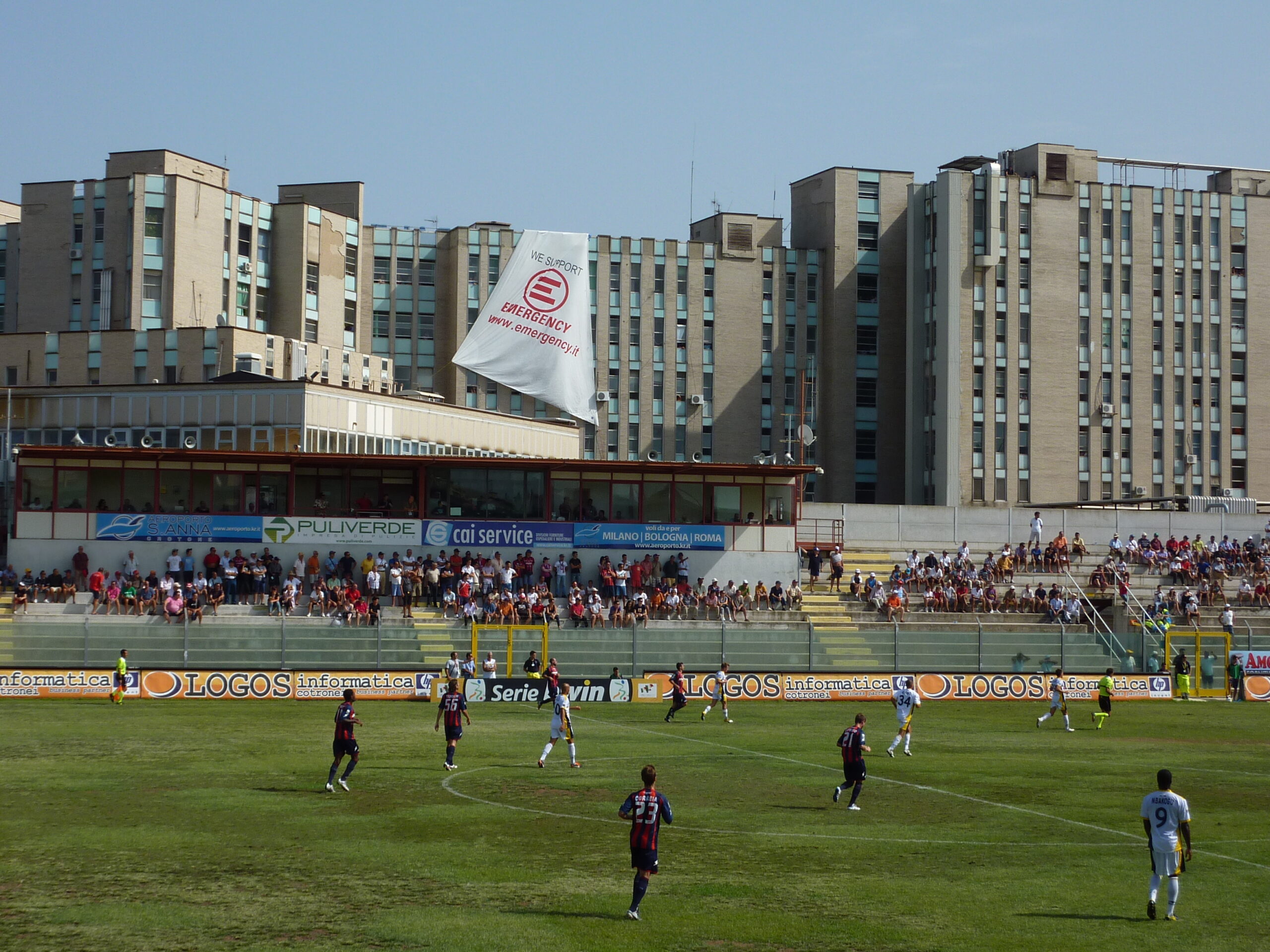 In poche ore trovano un accordo col commentatore della partita Crotone – Juve Stabia che si gioca l’indomani, per passare dei messaggi di solidarietà con Francesco ed Emergency. Allo stesso tempo, ottengono anche il permesso per Angelone e me di accedere al tetto dell’ospedale con la nostra vela.