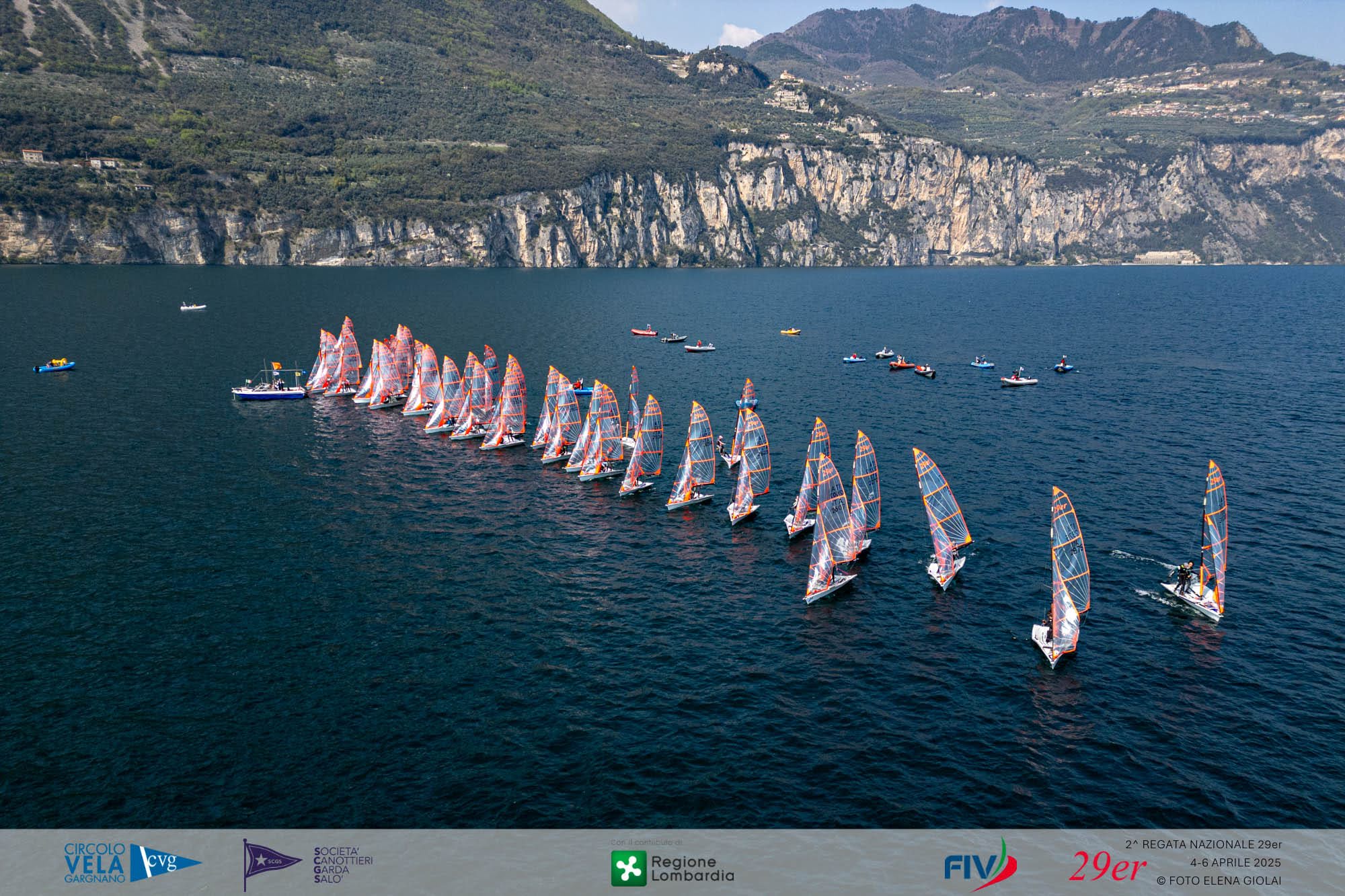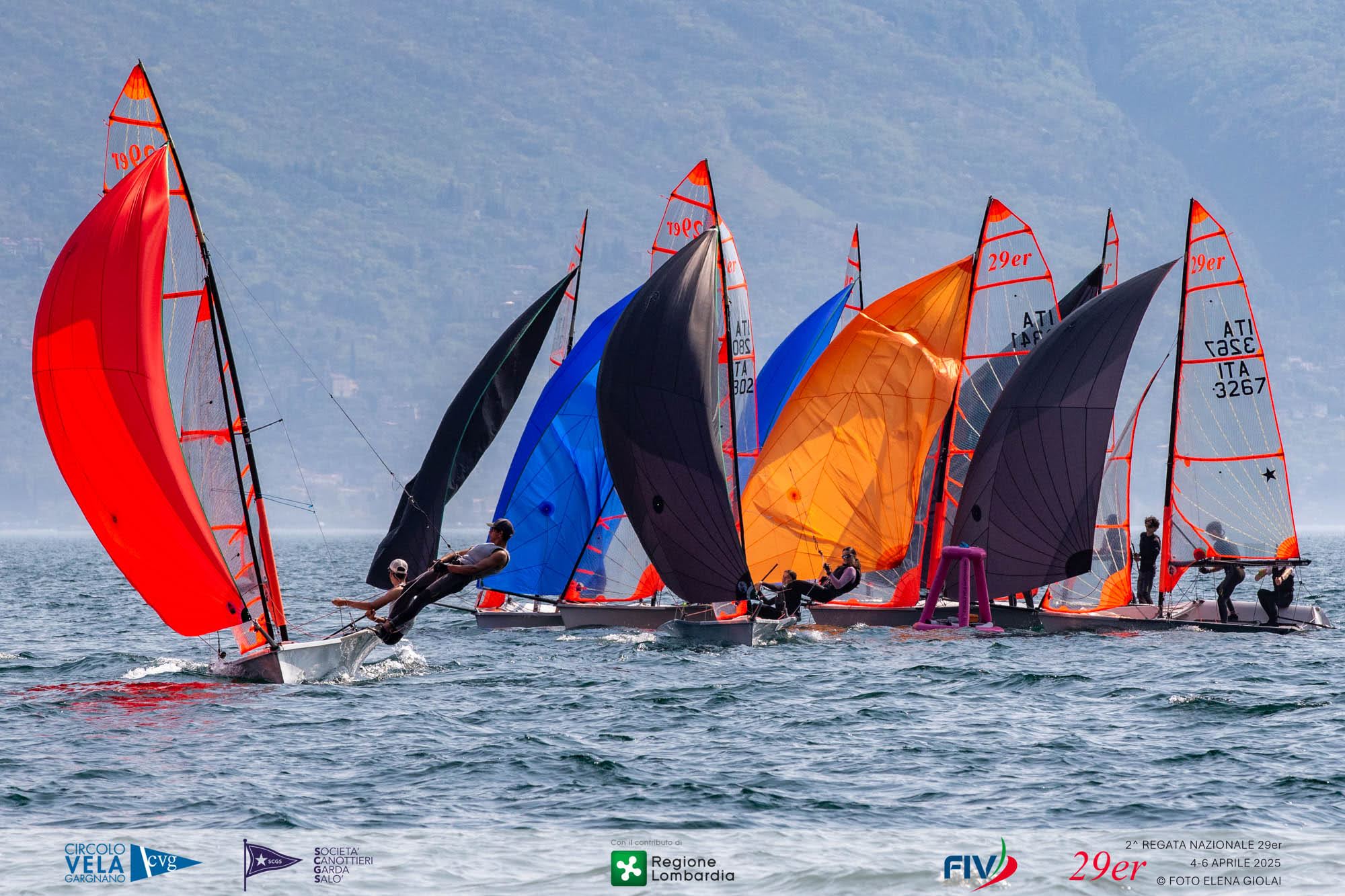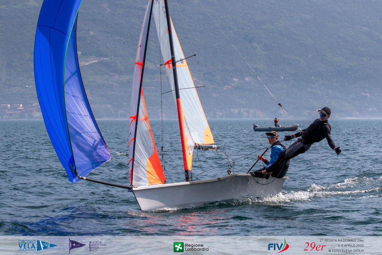 Forty crews arrived on Garda from all over Italy for the FIV National 29er Regatta organized by Circolo Vela Gargnano in collaboration with the Garda Salò Rowing Society, with the contribution of the Lombardy Region. Light winds on the first two days of the event (6-10 knots), then the final day that saw the entry of the “Vinessa,” the south wind typical of Garda, pushed by the bora triestina, which blew more decidedly between 12-13 knots.