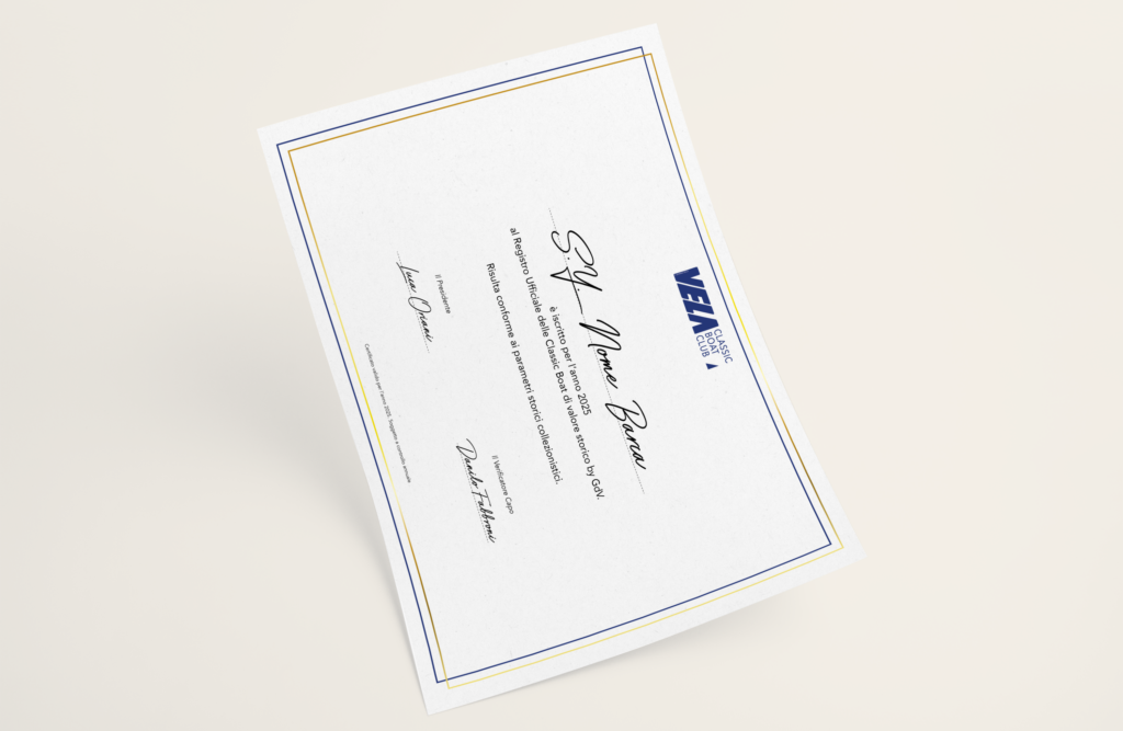 - Targhetta e Attestato di certificazione di Valore Storico e Collezionistico per la tua imbarcazione;