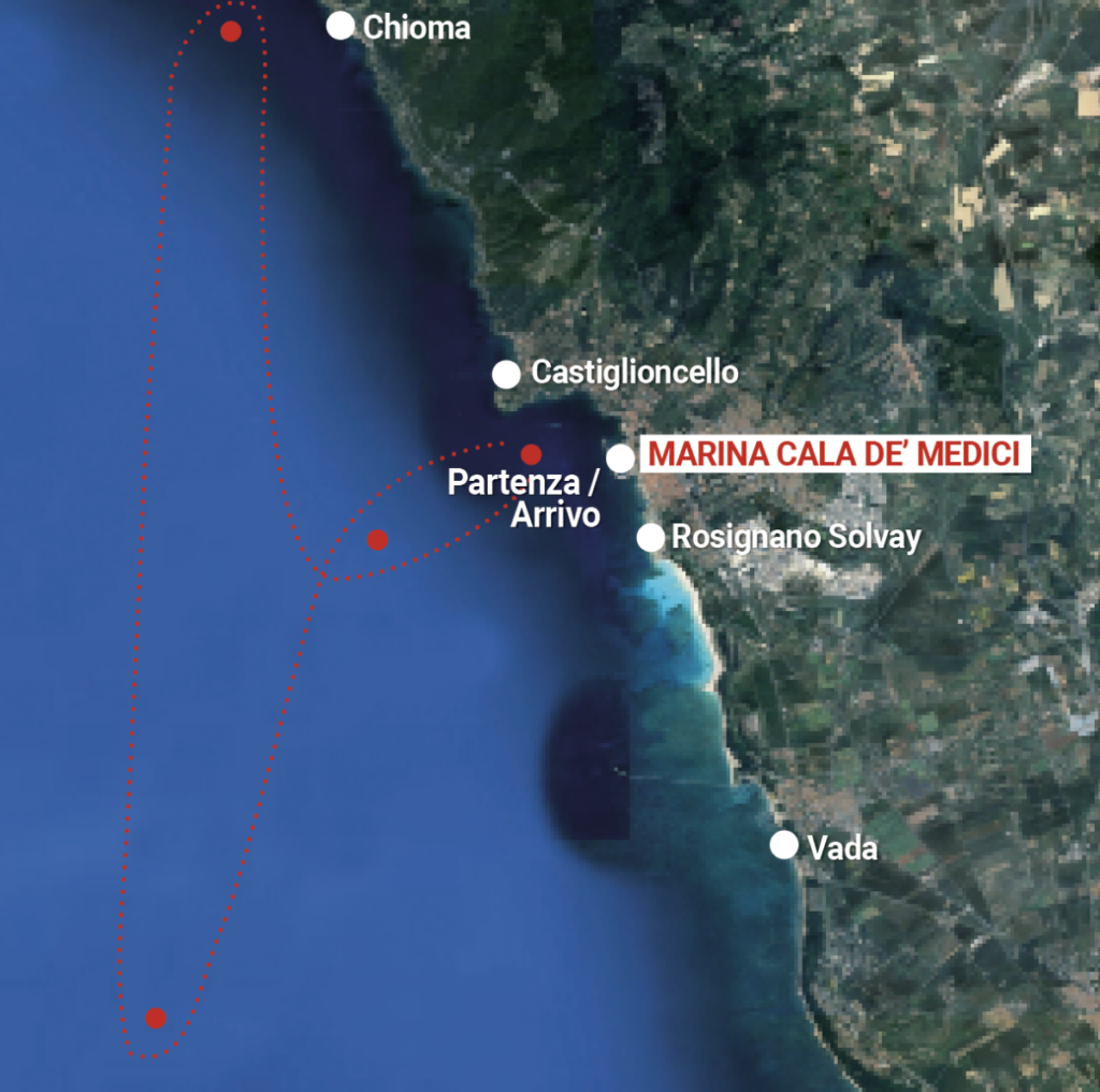 Afterwards, all you have to do is have fun along the coastal route designed for you along the Costa degli Etruschi, which lasts a maximum of 4 hours and takes you to discover the Gulf of Castiglioncello. You start in front of the waters of Marina Cala de’ Medici and, after turning the disengagement buoy, you head for the second buoy off Vada, a hamlet of Rosignano Solvay. For the third buoy you head back in a northerly direction, the point where the third buoy is placed is in front of the port of Chioma, mouth of the stream of the same name, after which you return in front of the Marina di Cala de’ Medici turning the disengagement buoy.