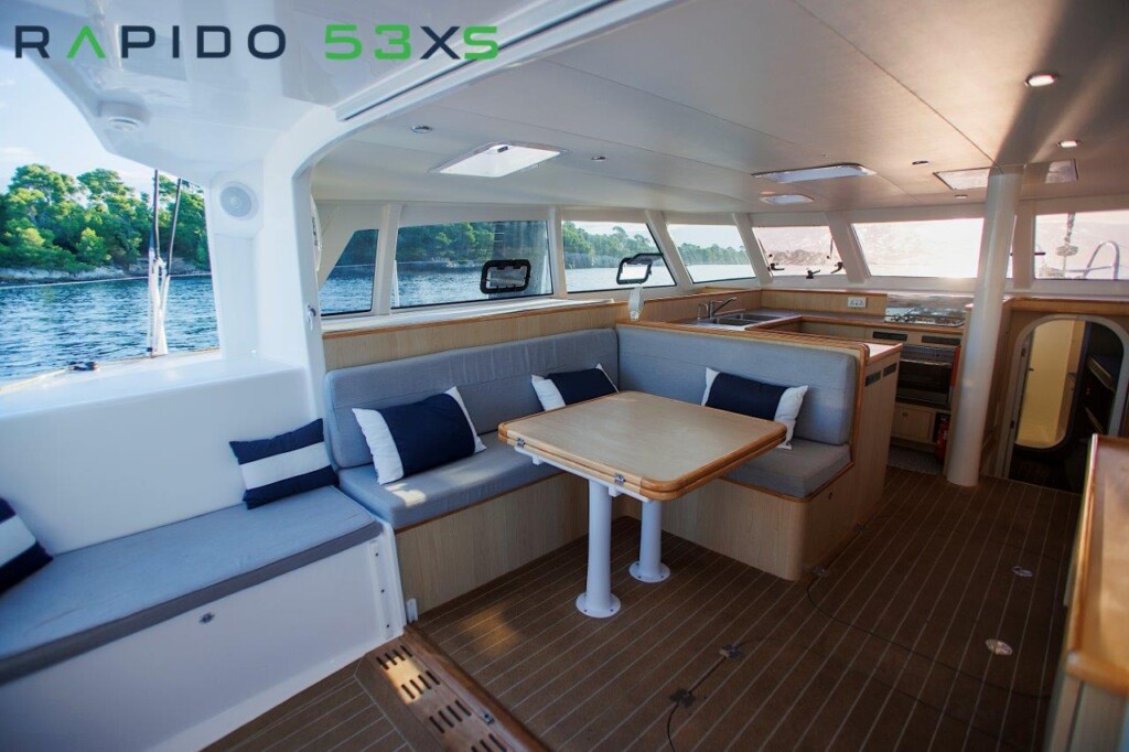 Il Rapido 53 XS riprende il design dello scafo da 50 piedi firmato Morrelli & Melvin, utilizzando una struttura fissa (ovvero non abbattibile) con l’aggiunta di 800 kg di sovrastruttura aggiuntiva. L’obiettivo di offrire un ampio salone, tre comode cabine e due bagni è stato perfettamente raggiunto: la differenza di volume tra il 50 e il 53 XS (che sta per eXtra Space) è impressionante. Il costruttore avrebbe potuto mantenere le linee principali identiche fra i due scafi, ma tutto è stato rivisto e migliorato sul 53: anche le appendici sono state completamente riviste.