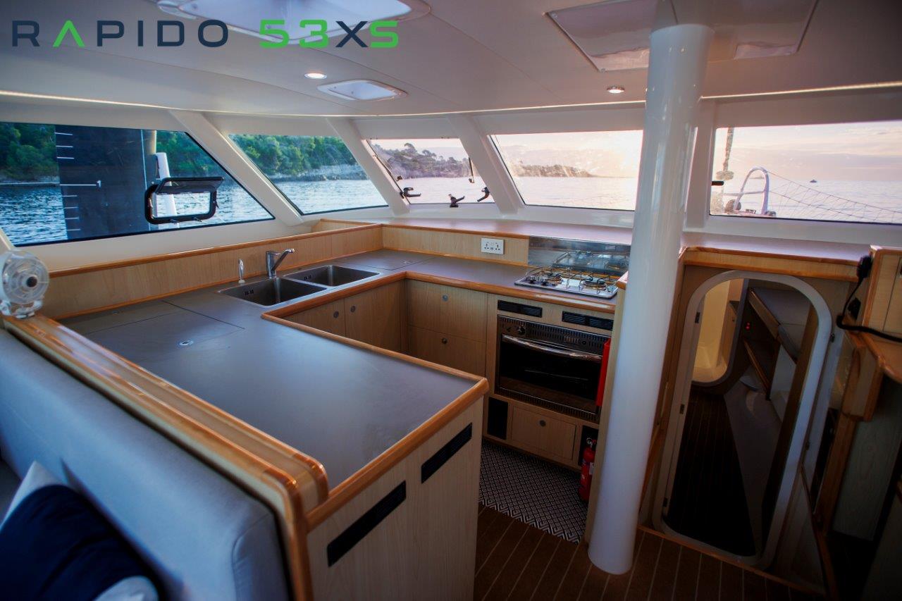 Il Rapido 53 XS riprende il design dello scafo da 50 piedi firmato Morrelli & Melvin, utilizzando una struttura fissa (ovvero non abbattibile) con l’aggiunta di 800 kg di sovrastruttura aggiuntiva. L’obiettivo di offrire un ampio salone, tre comode cabine e due bagni è stato perfettamente raggiunto: la differenza di volume tra il 50 e il 53 XS (che sta per eXtra Space) è impressionante. Il costruttore avrebbe potuto mantenere le linee principali identiche fra i due scafi, ma tutto è stato rivisto e migliorato sul 53: anche le appendici sono state completamente riviste.