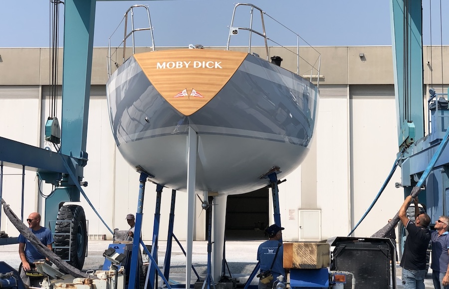Costruita dal cantiere di Peppino Gallinari ad Anzio, Moby Dick è un piccolo capolavoro in lamellare, realizzato con quattro strati incrociati e incollati a 45° di Okumè da 6 millimetri, all’epoca, il più leggero in circolazione. Sarà una costruzione così perfetta da battere, per leggerezza e rigidità, quelle in alluminio. Oggi, refittata a dovere, vive una nuova vita, tornata ai fasti del passato e, peraltro, ritornata nelle mani di famiglia. L’armatore è, infatti, Lorenzo Bortolotti, che dagli anni ’70 frequenta i campi di regata nostrani e non. È lui che ha recuperato Moby Dick, scafo di famiglia, restituendole il rilievo che merita e gli antichi splendori dopo averla venduta ben 40 anni prima…