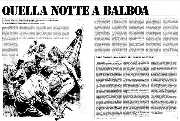 Balboa, giugno. Oggi festeggio i miei otto giorni di esistenza, e cioè è una settimana che io e Luciano abbiamo la sensazione che ogni giorno è un anniversario da festeggiare. Senza voler evocare il Grand-Guignol, la sporca signora in nero con le sue grandi ali di pipistrello e la sua falce a bandoliera, ci ha reso una visita interminabile e solo per poco non ci si è attaccata addosso. Io credo che saprete della nostra avventura, perché abbiamo parlato al telefono con Giorgio Falck, a cui Luciano ha descritto gli avvenimenti e deve essere apparso qualche articolo sui giornali. Una nuova era di pirateria verso barche da diporto è cominciata. La polizia americana della zona del canale di Panama ci ha confermato questa nuova criminalità. Ecco la cronaca. La mia cronaca.