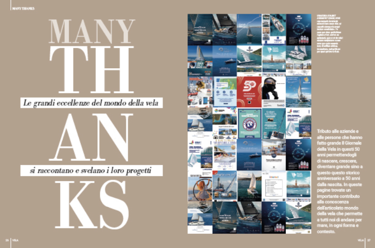 L’ultima sezione si chiama “Many Thanks”: il tributo alle aziende e alle persone che hanno fatto grande Il Giornale della Vela in questi 50 anni permettendogli di nascere, crescere, diventare grande sino a questo questo storico anniversario a 50. In queste pagine troverete un importante contributo alla conoscenza dell’articolato mondo della vela che permette a tutti noi di andare per mare, in ogni forma e contesto.