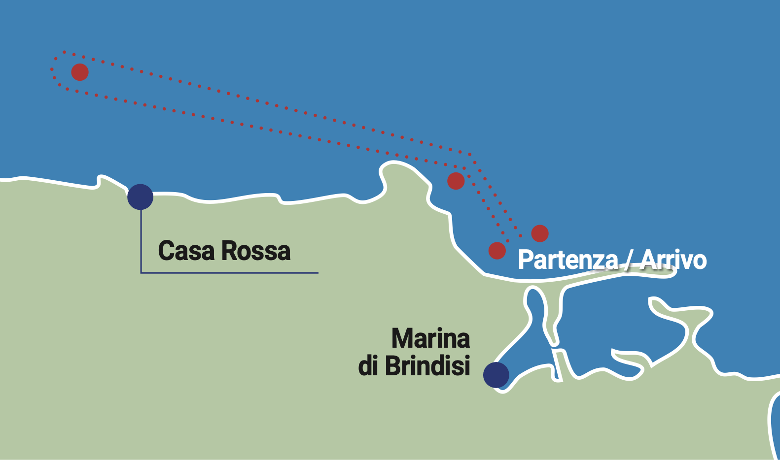 Si parte a nord della Diga Puntariso, fuori dal porto di Brindisi. La prima meta è la boa vicino all’Area di interesse storico-naturalistico di Punta Penne-Punta del Serrone. Da lì, un bel giro lungo la costa fino alla seconda boa, che si trova non lontano dall’Area Marina Protetta di Torre Guaceto. Quindi si vira e si torna verso la linea di partenza. Totale: circa 13 miglia di divertimento!