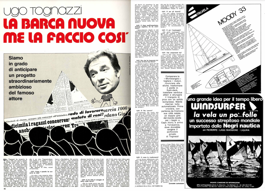 Ugo Tognazzi has discovered sailing and now devotes all his free time to his new passion. From someone like him, of course, one should expect great things: to learn about his plans, his aspirations, we approached him during the shooting of his latest film, “Cattivi pensieri.” The Cremonese actor willingly agreed to explain his new passion to the readers of the SAIL JOURNAL, and it was an interesting experience for the reporter. The interview, in fact, began on the set with Tognazzi saying, “My latest discovery is…” and at that moment Edvige Fenech appears all naked ready to interpret a scene from the film that is a true Tognazzi-show. Ugo in fact is the director and the main actor. His father, son and a cousin act in it, while another cousin is the architect who takes care of the scenes. But, past the shock, here comes the interview.