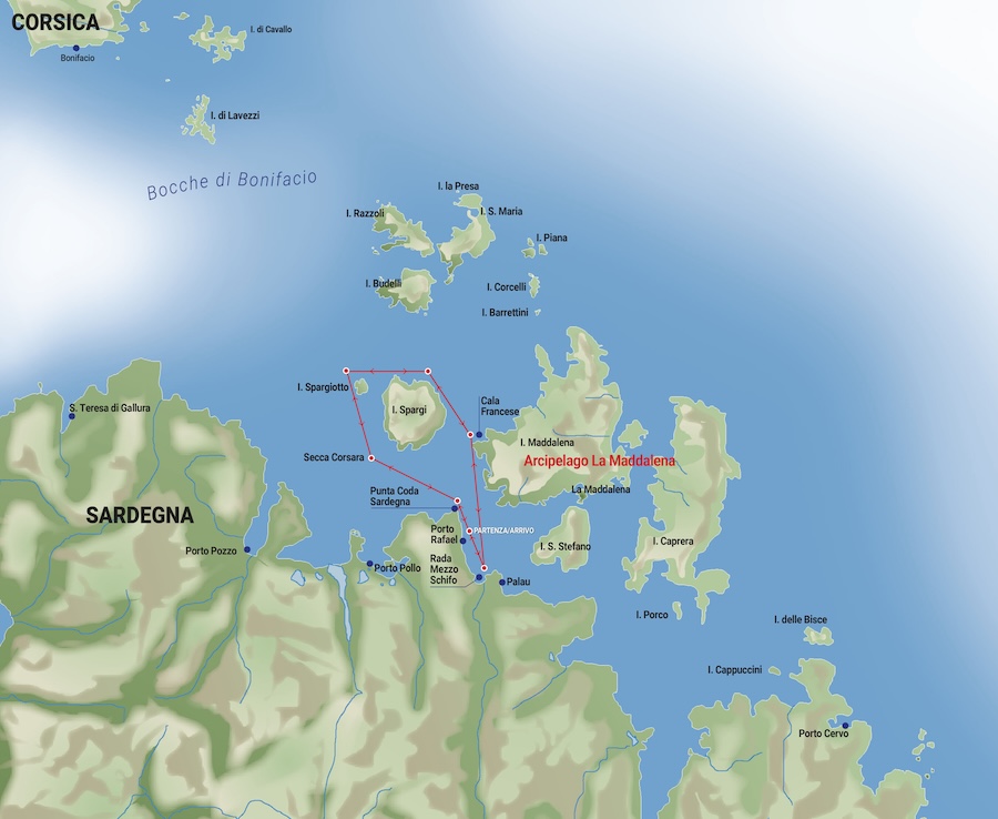 La regata della VELA Cup di Porto Rafael – Palau prende il via dalla suggestiva e accogliente Marina di Porto Rafael, situata in una posizione strategica per esplorare l’Arcipelago della Maddalena. Si lascia subito la costa puntando verso sud, fino a raggiungere la splendida Rada di Mezzo Schifo, che si trova poco a ovest del centro di Palau e del suo celebre golfo, meta ambita dagli appassionati di vela. Da qui, la rotta vira decisamente verso nord, con destinazione la costa ovest dell’isola della Maddalena e, in particolare, la scenografica Cala Francese, una baia incantevole incastonata tra rocce granitiche e acque cristalline. Dopo aver superato questo tratto, si procede verso ovest per circumnavigare l’isola di Spargi, una delle perle dell’arcipelago sardo. Oltrepassato anche l’isolotto di Spargiotto, si vira nuovamente a sud, costeggiando Secca Corsara e Punta Coda Sardegna, fino a ritornare davanti alla Marina di Porto Rafael.