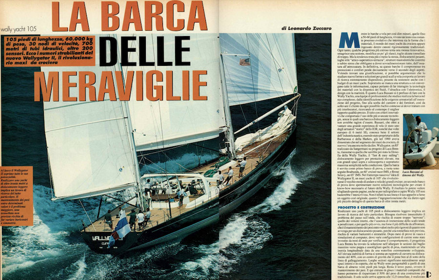 While smaller sailboats, so to speak, those up to 50-60 feet in length, experience a slow but steady evolutionary process involving both shapes and materials, the world of maxi cruising yachts appears plastered within strictly traditional canons. Every now and then, a few more imaginative designers attempt a renovating move, slimming down a section, modifying the soaring a bit, removing a few too many tons. But the trend remains more or less the same, heavy displacement tugs “penthouse-super penthouse-terrace” style, mammoth structures forced to undergo stresses that force the need to oversize everything from the framework to the rigging. Ultimately, on these boats the trade-off between performance and comfort leans decidedly toward the second of the aspects. Wanting to find a justification, it could be argued that studying new shapes and solutions for large sailing hulls involves extremely expensive research work, heavy to bear even with the budgets of a maxi yacht. Especially if it lacks a structure to which all information converges, capable therefore of making material technology interact with fluid dynamics, hydraulics with electronics, design with seamanship. And that is what Luca Bassani has set out to do with Wally Yachts, a team of professionals who study and realize the boat as a whole, from the identification of the owner’s needs to the execution of the project, up to the choice of the shipyard and suppliers, so as to relieve the client of any possible risk associated with having to deal with multiple interlocutors, while seeking the best value for money. All with innovative criteria involving the use of the most advanced technologies, without which a light displacement boat would have no reason to exist. Bassani, who in addition to boasting a great deal of sailing experience (he was one of the “historical” owners of the IOR, as well as a two-time European 6-meter SI), knows the yachting industry well, having been the owner of Barbarossa and Harken, already in 1989 showed that in the maxi cruising segment, there was still a lot to be said again. Wallygator, an 85 “built by Sangermani to a design by Luca Brenta, summed up what would later be the philosophy of Wally Yachts, ‘fast & easy sailing’:light displacement for high performance, but with large spaces above and below deck and above all maximum simplicity in handling. That boat served as the first test bed, followed closely by Boabunda, a 60” IMS cruiser racer, and Rrose Selavy, a 65 “IMS. In the meantime, the idea of Wallygator II was born, a 105” maxi yacht that would revolutionize the old way of big cruiser sailing, a second testbed where new technological solutions could be tested to create the know-how necessary for Wally’s future. You can see the result by flipping through these pages, although to x-ray and understand Wally 105 would not take the whole magazine. In fact, it is not its line and appearance that make it such an original object, so much as the engineering behind every smallest detail of this boat of over thirty meters.