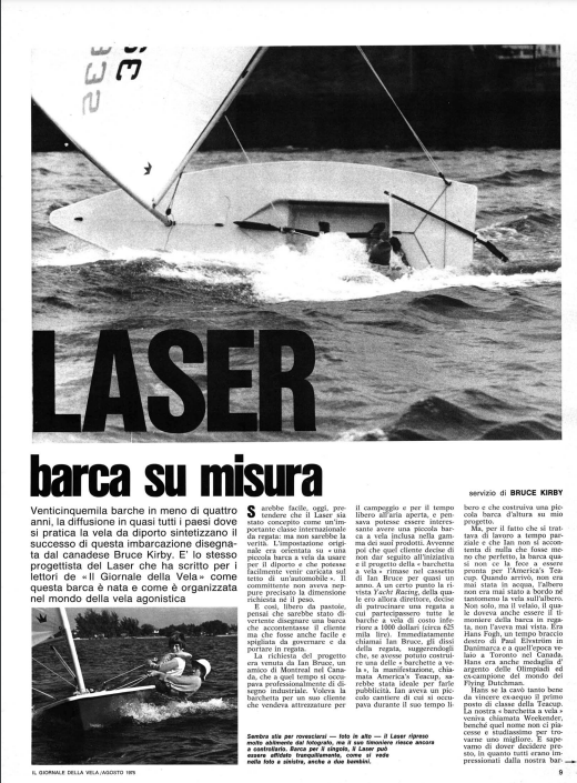All of these factories are either owned by Performance Sailcraft or its affiliates: namely, the company that Ian Bruce initially created to build the Laser. “Monopoly” construction was one of the main obstacles to recognition by the International Yacht Racing Union. Many IYRU delegates argued that the organization could not possibly support a single world builder. But others from the various committees-including the president, the Italian Beppe Croce-realized the importance of such an operation. With the presence of a single builder there was no danger that one yard more than the other would set out to make a better boat, what has been the biggest problem for other international classes. With the Laser, the construction technique was moto carefully determined initially and is followed to the letter by every yard. The last thing in the world that Performance Sailcraft wants is a better or worse Laser or a cheaper or more expensive Laser. The primary interest of the builder, as well as that of the buyer everywhere, is that the boat remain exactly the same no matter where it is built. It is worth pointing out that many IYRU delegates took a very thorough look at the organization’s bank account when they considered the Laser class’ application for international status. When that application was submitted in 1972, there were at that time nearly 10,000 boats already in operation. At one dollar per boat the bill was done and it was a nice help to the Union budget. But the decision was delayed for a year, and by that time the Lasers had grown to 17,000. As one of the delegates said in 1973, “We can’t afford not to have this boat.” Further assurance that the Laser was one-design came in 1974 with the adoption in Annapolis, Maryland, of a computerized system for cutting the sails and securing the stitches along the seams by ultrasound so that the shape could not badly be changed. Initially Hans Fogh made all sails in his Toronto sailmaking shop. Because of the huge quantity-up to 40 sails a day-he got excellent assistance from the Dacron manufacturers. There are many weaving looms busy just making fabric, 24 hours a day, for the Laser, in the Boston plant. The sails continue to be cut on exactly the same pattern devised at the time by Hans Rogh, and they are the same ones we chose that wet, windy day in Montreal in 1970. Only now each third is cut with minimal tolerances by a computerized machine. Then the seams are stapled, also with computer-adjusted precision, and the sails are thus distributed to different sailmakers around the world where there are laser factories. The sailmakers do the stitching put the corner reinforcements and the board as well as the grating. But none of this work can change the characteristics of the sail, which are dictated by the electronic computer. The IYRU is very pleased with this system, as this further ensures a uniform product and also escapes the accusation of monopoly by allowing sailmakers in different countries to supply sails and thus have an economic benefit. Of course, I am partisan toward this “little boat that” was born out of an occasional phone call, but when I think of the Laser from the point of view of the journalist, which I was long before I became a boat designer, I can see this class, in perspective in its gradual growth and spread throughout the world. as destined to increase further. Communist countries oppose the spread of the boat on the pretext that and producing it is a monopolistic enterprise, but at the same time many excellent sailors in Eastern Europe are willing to admit that the Laser is indeed a “people’s boat” and is therefore in harmony with Marxist ideology. It is difficult for them to judge favorably a boat that can only be built by one yard: but they like it very much and are persuaded that it would immediately become popular in their countries. All of us, intimately involved in the Laser affair, kept a close eye on the market these first two years, to see if there were any signs of saturation. But then we began to realize that there is really no saturation point. There are always enough new people coming into sailing around the world to cause the steady growth of this class for many years, maybe forever. And the more the Laser expands, the more stimulating it is for me to look back at the original drawings, sketches and calculations and think how many people get joy out of it.