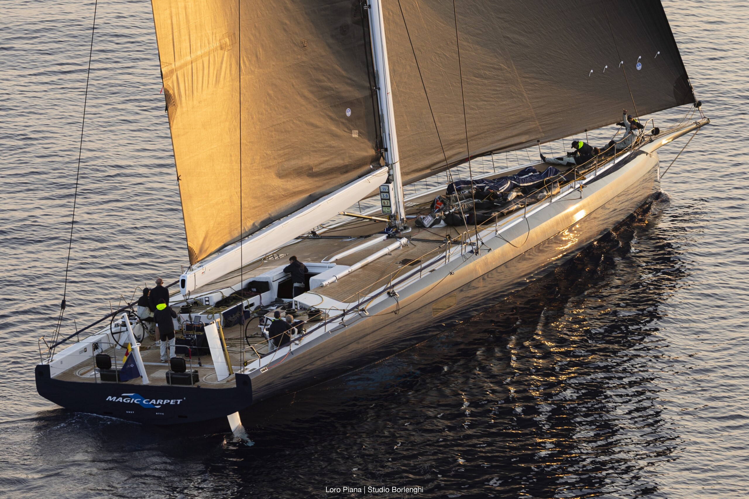 And the maxi 100 Scallywag and Magic Carpet E, another 100′, are well aware of this, as they put on a fierce match race in the Gulf of Genoa, with Scallywag coming out on top only at the last mile, just 2 minutes ahead.