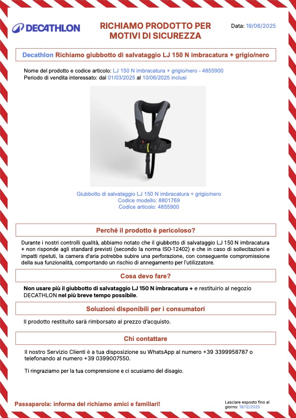 Un malfunzionamento che potrebbe esporre al rischio di annegamento. Il prodotto è stato venduto dal 1 marzo al 10 giugno di quest’anno. Decathlon invita chi lo possiede a non utilizzarlo e a riportarlo in uno dei propri punti vendita dove sarà rimborsato integralmente.