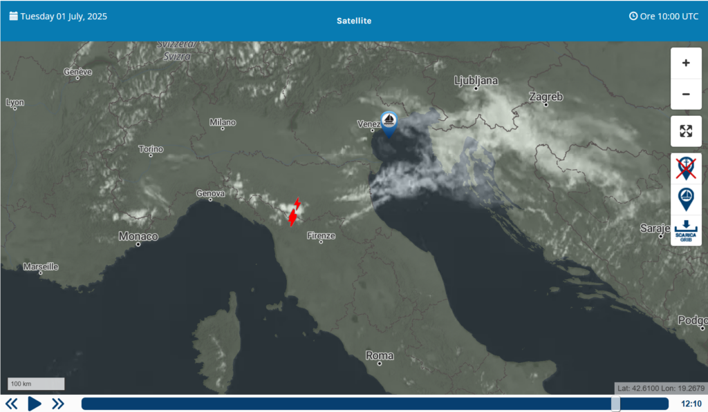 Troppo spesso i temporali in mare vengono sottovalutati. In realtà, sono fenomeni complessi e potenzialmente pericolosi, capaci di generare raffiche improvvise di vento oltre i 40 nodi, con variazioni repentine di direzione, mare corto, disordinato e difficile da gestire, oltre ad una visibilità ridotta a poche decine di metri. Monitorare un temporale attivo sulla mappa dei fulmini permette di capirne la traiettoria, stimarne l’evoluzione e decidere se modificare la propria rotta o salpare in anticipo l’ancora in rada.