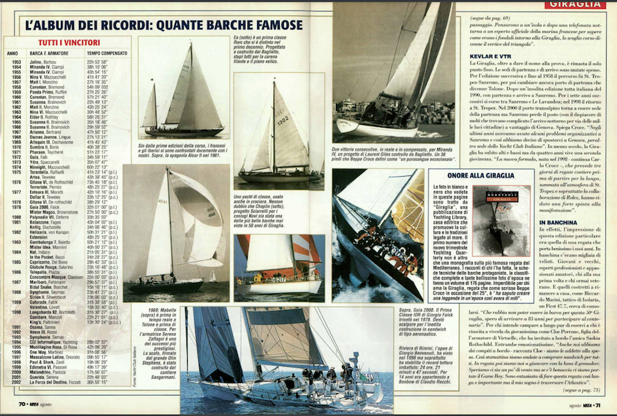 Dice Ernesto Gismondi, proprietario di Edimetra “Mi piace molto la Giraglia, mi piacciono le cose che si affermano nel tempo, che hanno una validità”. E spiega “E’una regata piena di imprevisti; parti con tanto vento, ti affanni fino alla Giraglia, credi di essere primo, poi c’è un salto di vento e ti passano. Ne ho fatte più di dieci, vincendone due”. Brillante sintesi di quelle amatissime e maledette 243 miglia di mare spesso faticose. Edizioni con tanto vento e grandi bonacce, trionfi e sconfitte clamorose, feste e sofferenza. 50 anni di vela che hanno visto in regata, almeno una volta ma più facilmente a ripetizione, manager rampanti, industriali delle grandi famiglie italiane, uomini di cultura, nobili ma anche migliaia e migliaia di velisti della domenica che hanno sempre considerato la Giraglia una sorta di esame di laurea che va affrontato.