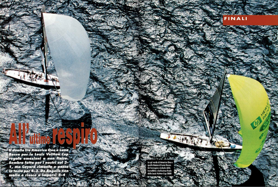 Il duello tra American One e Luna Rossa per la Louis Vuitton Cup regala emozioni a non finire. Sembra fatta per i nostri sul 3-1, ma Cayard rimonta e passa in testa per 4-3. De Angelis non molla e riesce a imporsi 5-4.