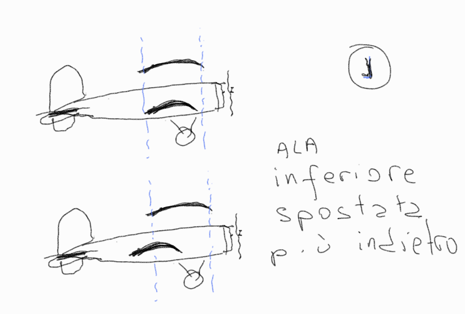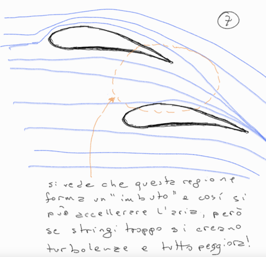 When air leaves a wing, it does so by moving tilted downward, and then, by moving the lower wing back a little bit you can use this flow to help this same wing (fig. 7).