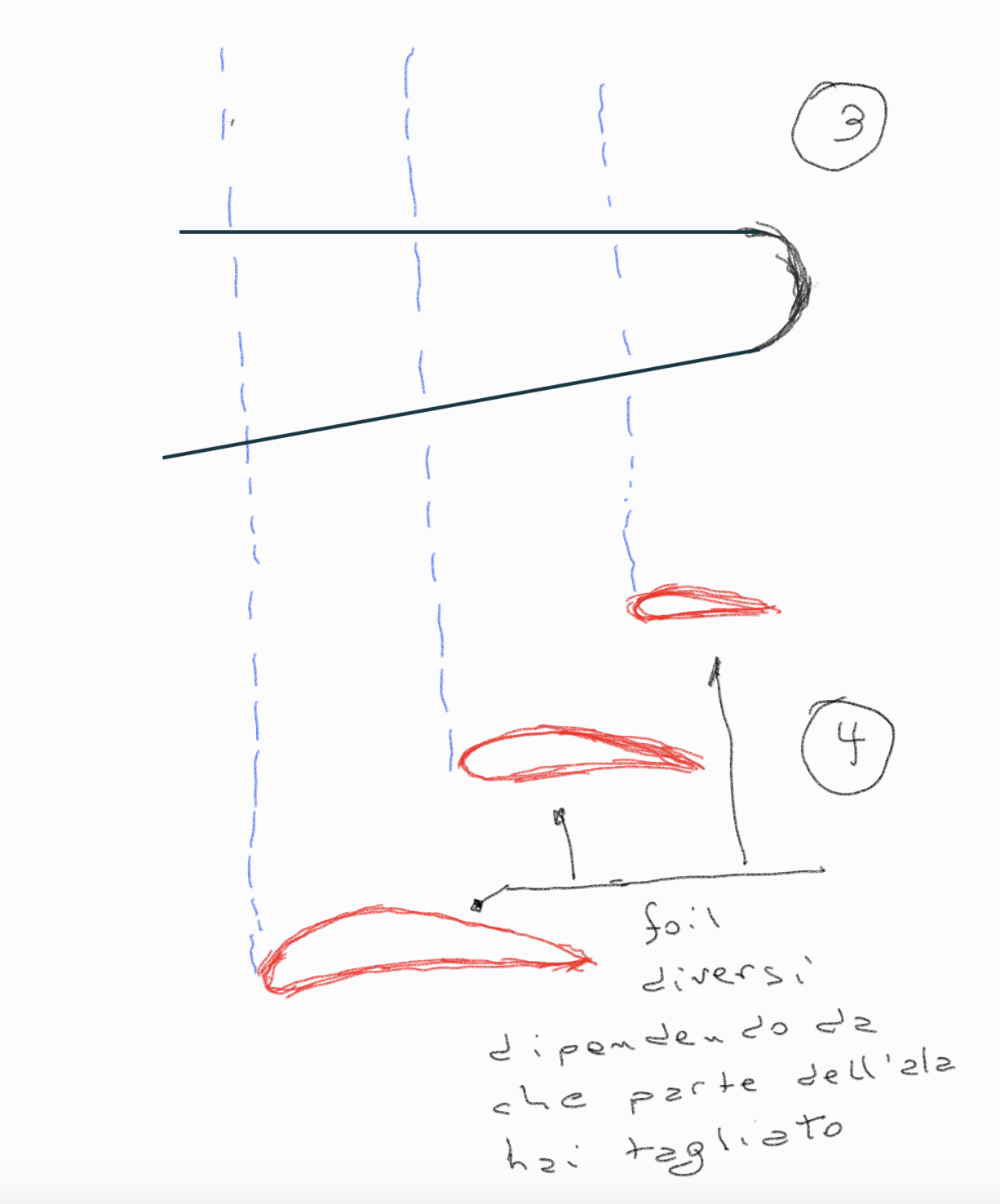 Let us think of a finished, that is, real wing (fig. 3). We know that by slicing it, like cutting a salami, we have the famous foils, i.e., the wing profile at that point where the slice was cut.