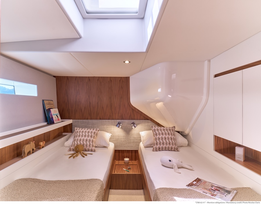 If it impresses on the outside with its functionality, inside the CNB 62 is a real home on the sea. The interiors, designed by Jean-Marc Piaton, are flooded with light thanks to large broadside windows and skylights in the deckhouse, a CNB trademark.“We wanted the interiors to reflect the freedom and serenity of ocean cruising,” explains Vincent Arnaud.“It’s not about extravagance, but harmony: a place where the owner and guests truly feel at home, even in the middle of the ocean.”