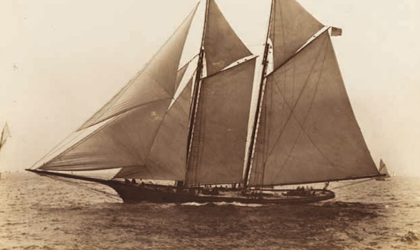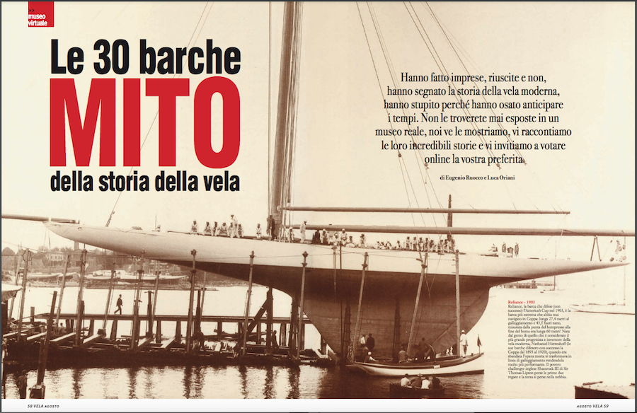 Reliance, the boat that defended (successfully) the America’s Cup in 1903, is the most extreme boat that has ever sailed in the Cup: 27.4 meters long at the waterline and 43.5 overall, measured from the tip of the bowsprit to the end of the boom it was 60 meters long! Born from the genius of what is considered the greatest designer and inventor of modern sailing, Nathaniel Herreshoff (his boats successfully defended the Cup from 1893 to 1920), when heeled the deadwork turned into a waterline making it much better performing. The poor British challenger Shamrock III owned by Sir Thomas Lipton lost the first two races and the third was lost in the fog. (Pictured above, Reliance)