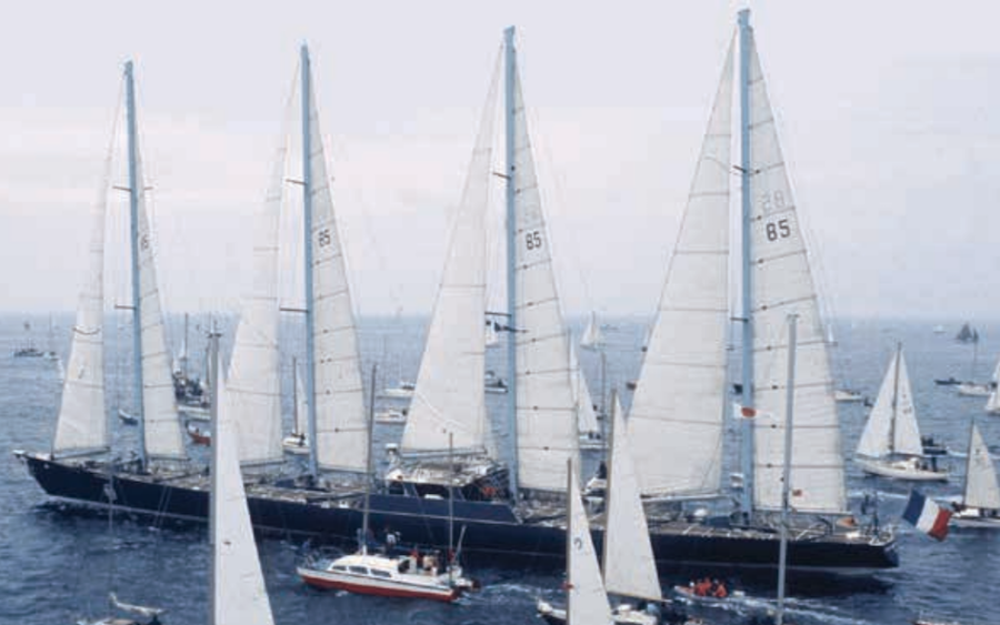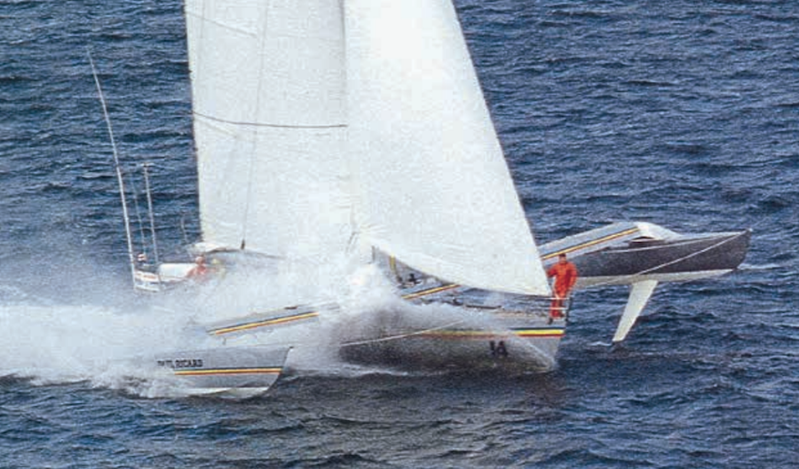 At the 1976 Ostar, everyone was stunned when Alain Colas showed up with Club Méditerranée: that is, 72 meters of boat (the largest that ever participated in an ocean race), 1000 square meters of sails, 280 tons of weight and four masts. Much ado about nothing: Colas will finish fifth, 7 hours and 28 minutes.