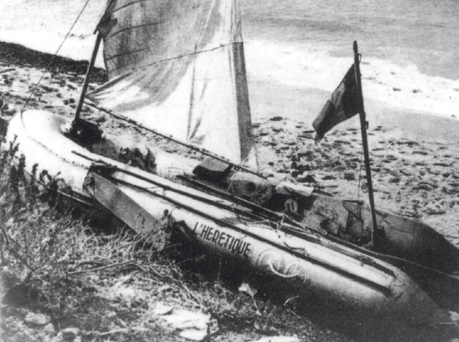 Everyone said, “He’s crazy,” when in 1952 French biologist Alain Bombard set out on an Atlantic crossing in a four-and-a-half-meter Zodiac sailing dinghy, theHérétique, without provisions. He wanted to prove that castaways die from psychological causes and not from lack of food and water. He succeeded, landing in Barbados (from Tangier) after 65 days adrift, during which he fed on plankton and drank seawater, calculated not to risk dying.