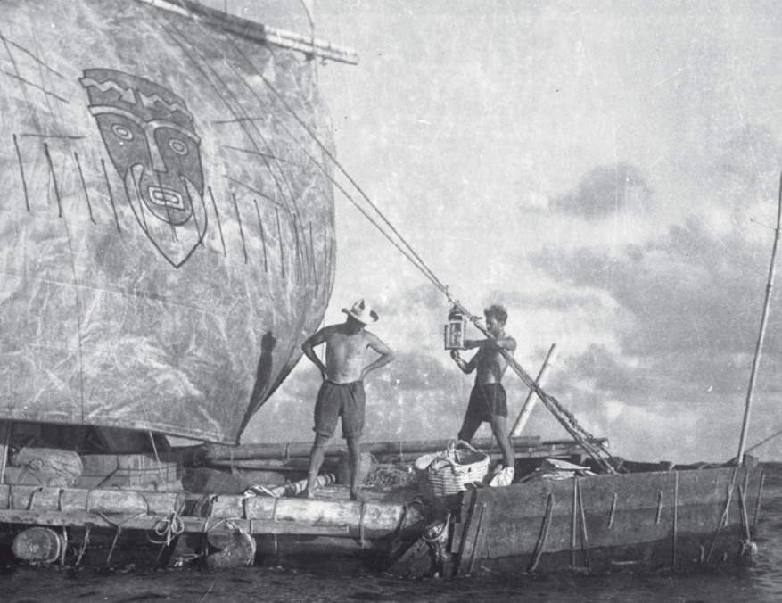 . Sul Kon Tiki, an Inca-inspired balsa wood raft (13.7 m long), Norwegian explorer Thor Heyerdahl sailed from Peru and landed in Polynesia: it was the first major media feat, apt to prove that the colonization of Polynesia could have occurred, in pre-Columbian times, by South American peoples.