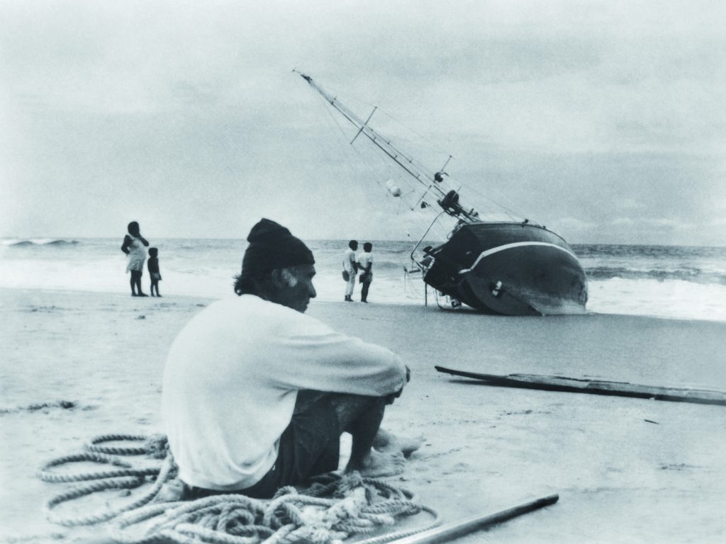 In 1980 Rondetto would change hands, with Pascoli engaged in new ‘adventures’. It was then the turn of Bruno Pietrangeli, who in 1982 subjected it to some restoration work, including refitting the deckhouse, laying a new teak deck, and greening the planking of the living work. With Pietrangeli the boat crossed the Atlantic for a fourth time, from Tenerife to Martinique in 30 days, and a fifth time in 1986, from Gibraltar to Fortaleza in Brazil, 3,300 miles in 41 days. But just a few miles off the Brazilian coast the lone Pietrangeli suffered food poisoning and ended up “dunnage,” leaving the windward helm to steer Rondetto, which beached itself near Fortaleza.