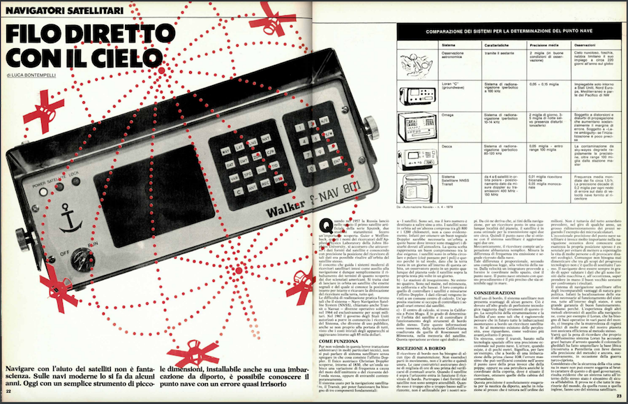 Quando nel 1957 la Russia lanciò nello spazio il primo satellite artificiale della serie Sputnik, due studio statunitensi fecero un’importante scoperta. Guier e Weiffenback, questi i nomi dei ricercatori dell’Appliede Physics Laboratory della Johns Hons University, si accorsero che attraverso i dati forniti dal satellite e conoscendo con precisione la posizione del ricevitore di tali dati era possibile risalire all’orbita del satellite stesso. Il concetto che guida i sistemi moderni di ricevitori satellitari intesi come ausilio alla navigazione è dunque semplicemente il ribaltamento dei termini di quanto scoperto dai due scienziati americani. Si tratta cioè di lanciare in orbita un satellite che emette segnali e del quale si conosce la posizione istante per istante e ricavare la dislocazione del ricevitore sulla terra, tutto qui. Le difficoltà di realizzazione pratica furono tali che il sistema Navy Navigation Satellite System (NNSS), chiamato anche Transit o Navsat, divenne operativo soltanto nel 1964 ed esclusivamente per scopi militari. Nel 1967 il governo degli Stati Uniti autorizzò a porre in commercio i ricevitori del Sistema, che divenne di uso pubblico, anche se non proprio alla portata di tutti, visto che i costi iniziali degli apparecchi si aggiravano intorno agli 85 mila dollari.